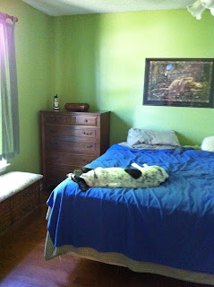 Corey and I have been planning to paint our bedroom since we moved in almost 5 years ago. Typically it is something that kept getting pushed to the back burner. A while back we decided to remove the carpet from the house and we started with the living room. That began the slow makeover process that we wanted for each room. Once we completed the living room we said our bedroom was next. When we received our tax refund we purchased the flooring (same as the living room) and a short time later we agreed on a paint color. As luck would have it, projects exploded at work and he's been working crazy hours with changes on the weekends so we have not had time to do anything with the room yet. He was sent to Gaithersburg, MD for 2 weeks for work. I talked to the kids and got them on board...we were going to makeover the bedroom while Corey was away and make the whole thing a surprise! The kids helped me move all of the bedroom furniture into the living room, except the bed...kingsize & wouldn't fit anywhere. We then took a couple days to paint the bedroom. Here are some pictures....